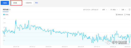 再来看一下,“8号苑”这三个字的百度指数。首先,一个小店能有被百度收纳,生成指数已经非常了不起了,其实你看他从11年开始,到现在9个年头,虽然有下滑,但是还是说的,作为一个单店,很了不起了。